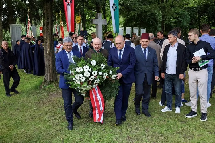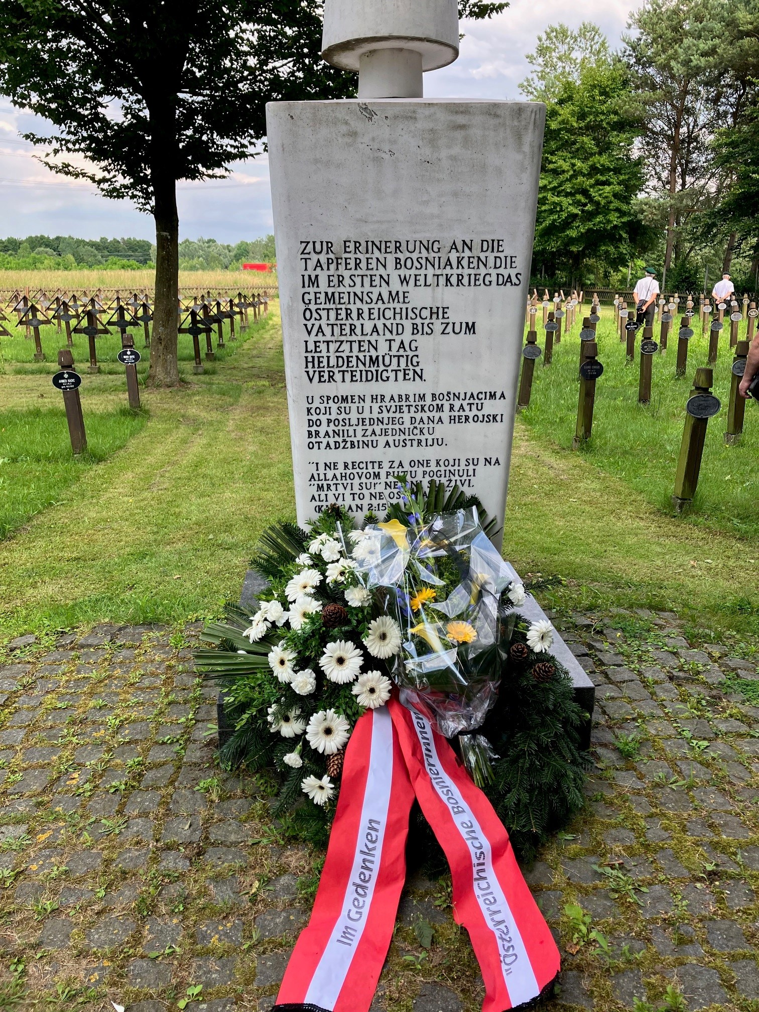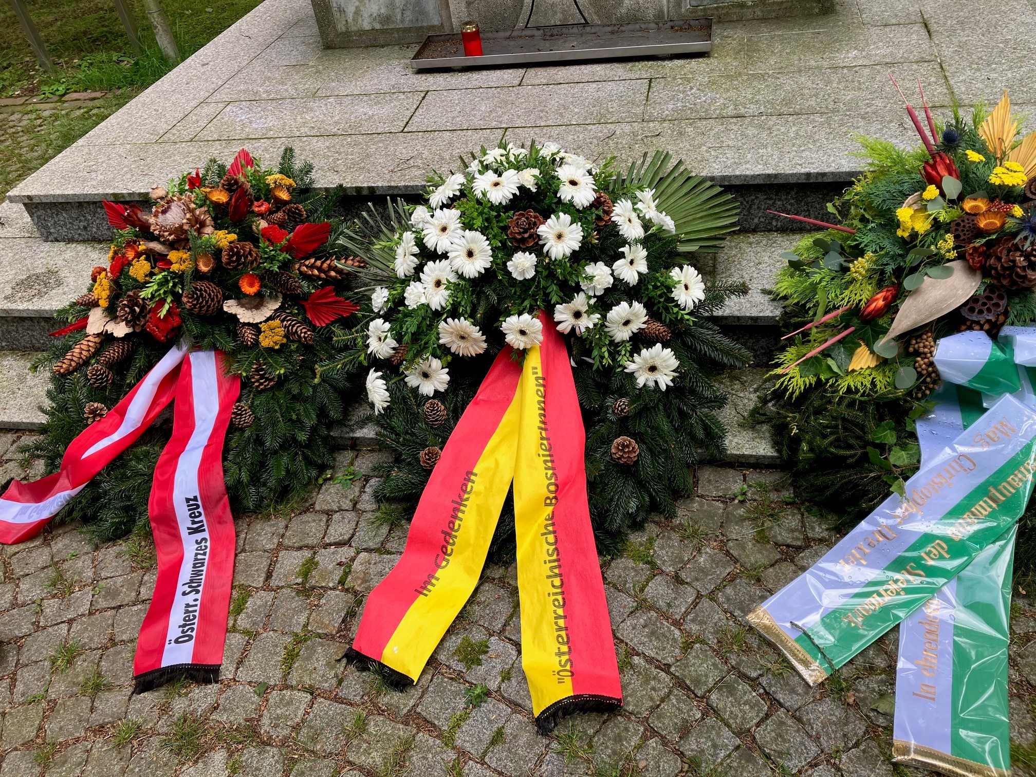 Die österreichischen BosnierInnen haben die sonderangefertigten Kränze mit den Kranzschleifen in rot-weiß-rot und gold-rot niedergelegt.