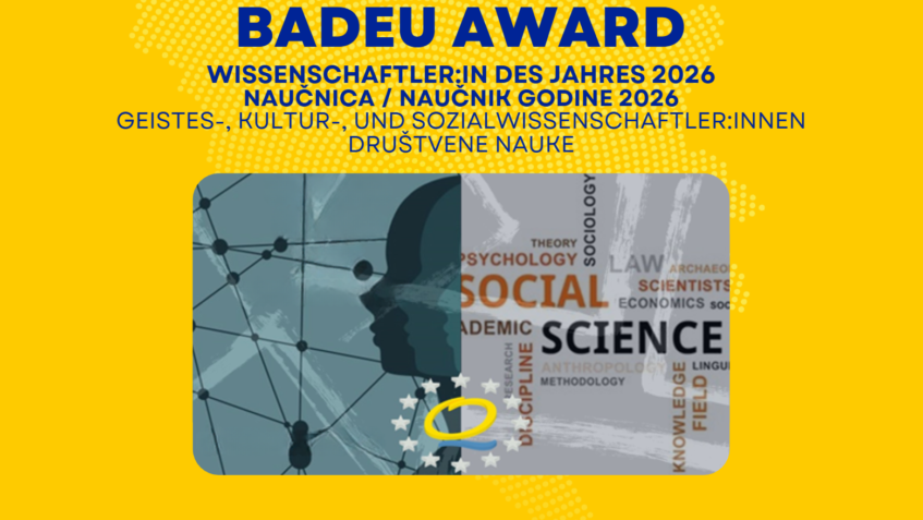 die Gesellschaft Bosnischer Akademiker in der EU (BADEU) lädt euch herzlich ein, euch für die Auszeichnung „Wissenschaftler/Wissenschaftlerin 2026“ im Bereich der Geistes-, Kultur- und Sozialwissenschaften zu bewerben.